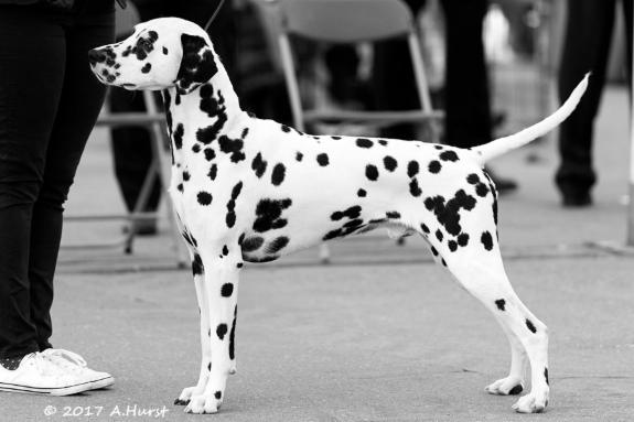 Cosmo has exceeded all our expectations with his show career to date. From attending only a handful of shows in puppy and junior Cosmo done amazingly well to achieve the following wins; The dog CC at Belfast Championship show against the current breed record holder,Ch Offordale Chevalier. He went onto win a Reserve CC at Midland Counties under a Breed Specialist and Reserve best in Show at the Scottish Dalmatian Club Open Show in August 2017. We are thrilled that Cosmo offers not just a show presence with sound confirmation and movement but also the most amazing outgoing temperament.
